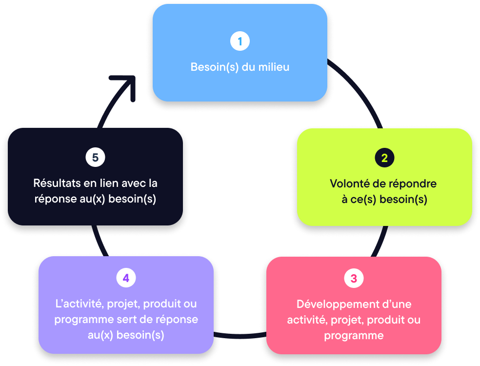 Il doit donc être recherché dans les résultats attendus des actions, activités et/ou projets, ceux-ci ayant été développés pour répondre à un besoin de la communauté. Ainsi, l’objectif de chacune des activités, de chacune des actions, de chacun des projets menés par les organisations est la réponse à un besoin du milieu. Les activités, les actions, les projets sont donc le/les moyens que s’est donnée une organisation pour répondre à ce besoin. C’est donc là que se situe sa contribution à la communauté, donc son impact social.